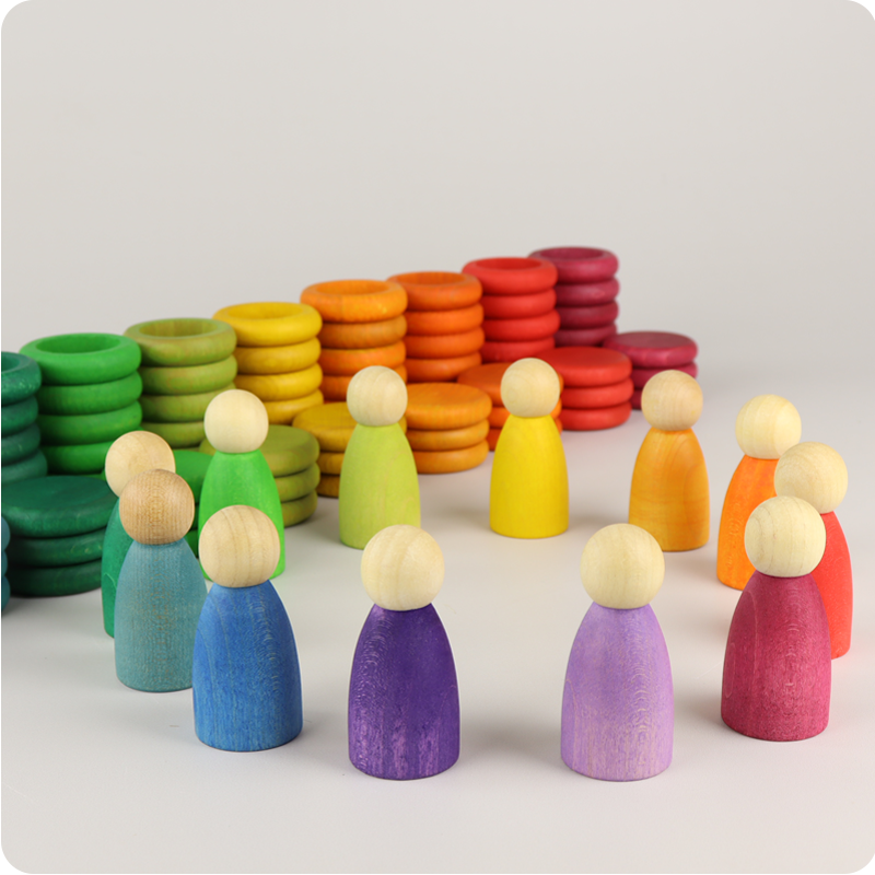Nins Carla allows for the development of logical-mathematical thinking by classifying, grouping, and matching elements though colours and/or shapes. These actions improve hand-eye coordination and motor skills. The rings become a material which can be used to thread, pile up and create different games. The Nins can be used as a symbolic game, to create stories and small worlds. In addition to the first pedagogical proposal, this material can be seen from a versatile perspective, which allows for it to be used in a broad number of ways. The adaptability of these materials contributes to creative and divergent ways of thinking.